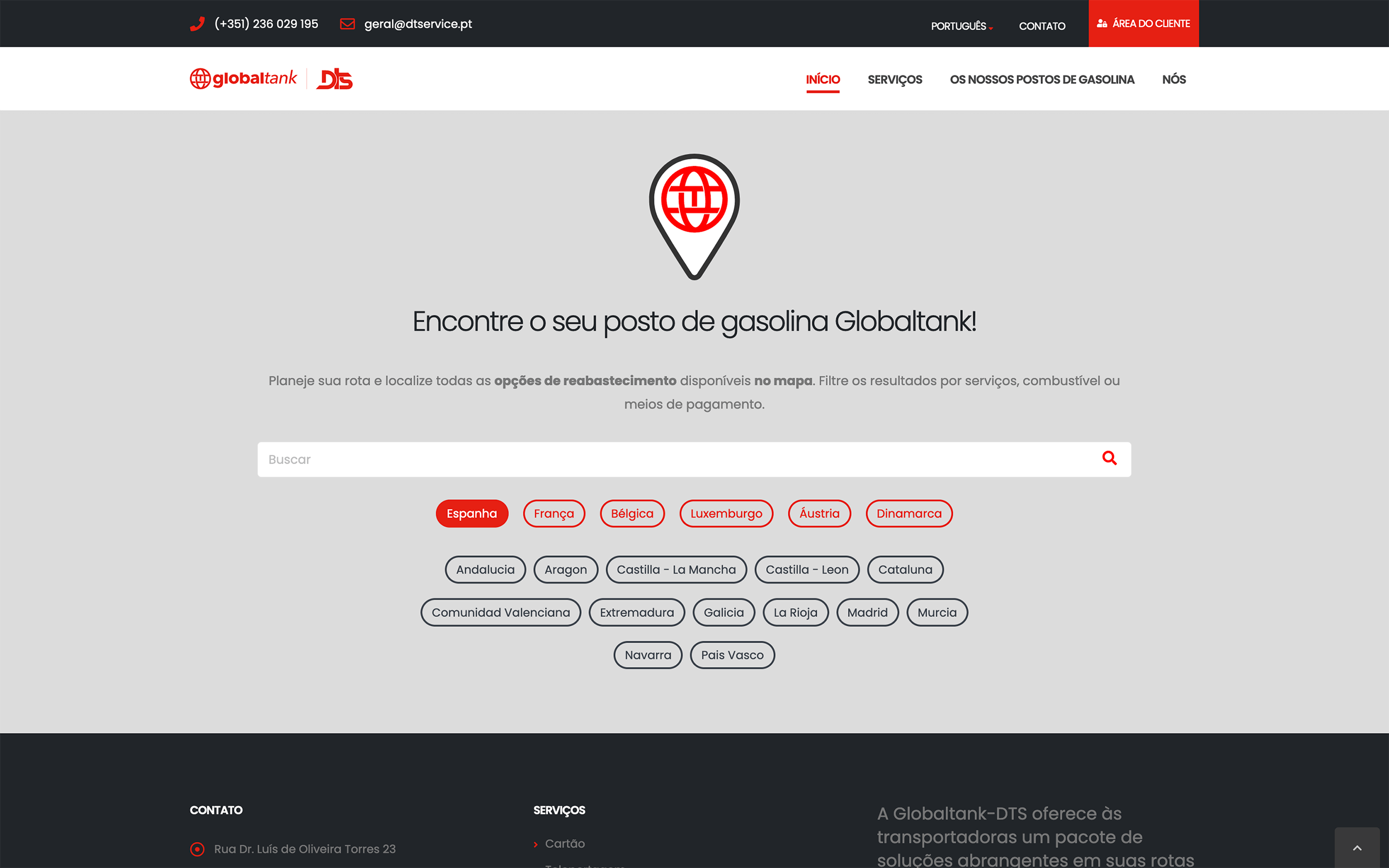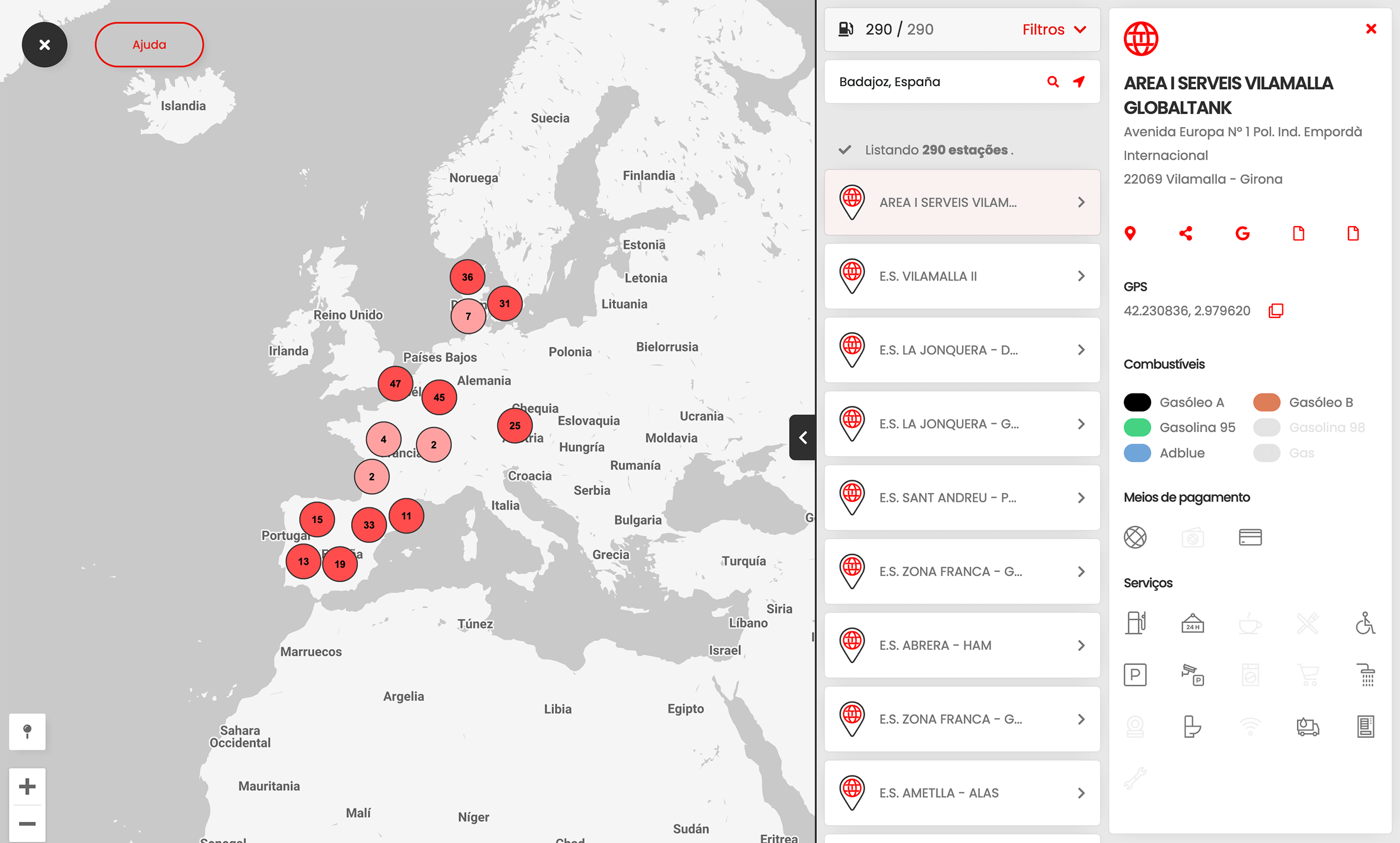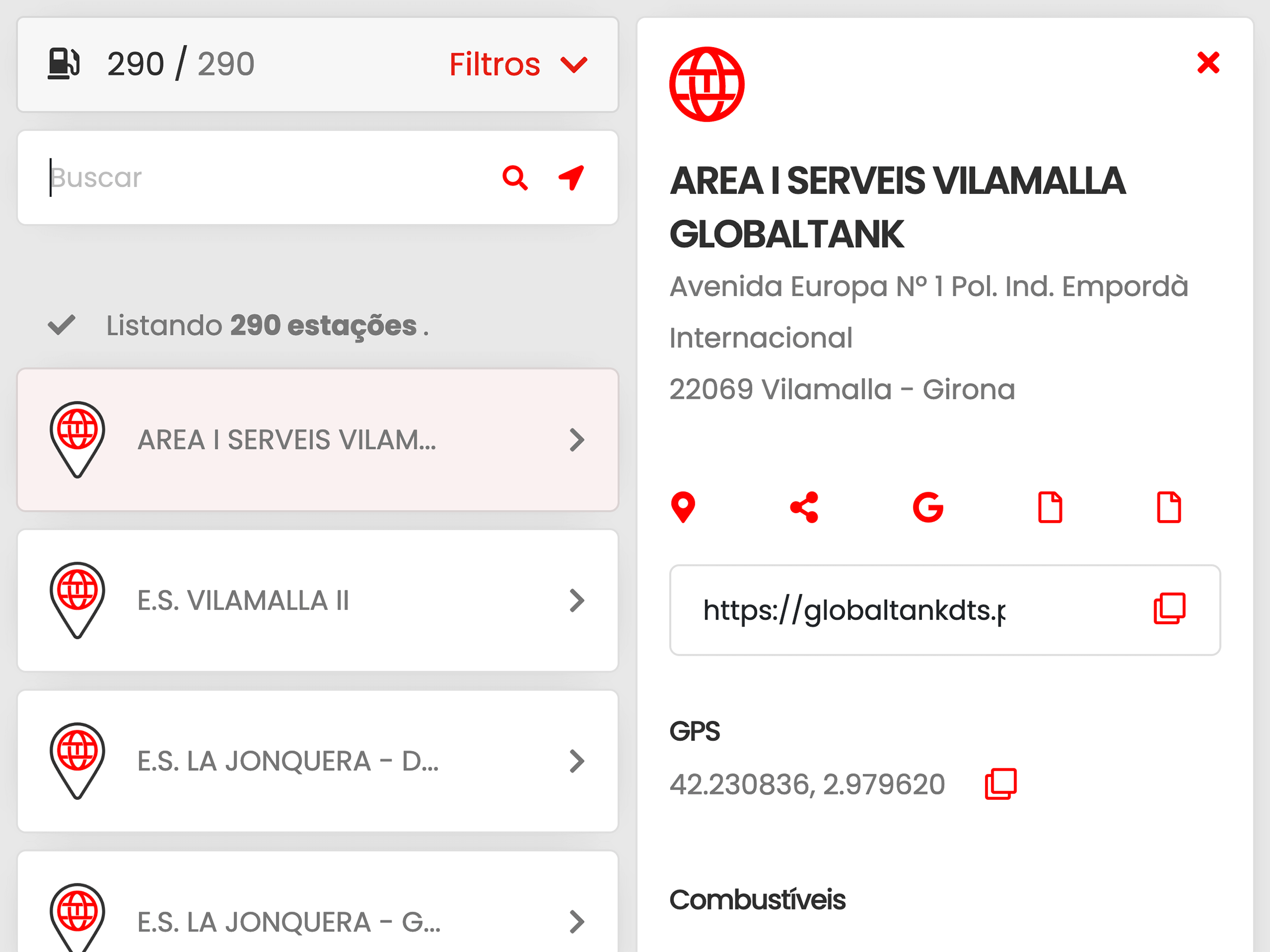 Além disso, você pode acessar a partir da página inicial, na seção Encontre seu posto de gasolina Globaltank. Clique nos botões para visualizar e listar as estações disponíveis por países ou comunidades autônomas. Digite uma cidade no campo de pesquisa e o aplicativo irá redirecioná-lo para o mapa e listar as correspondências obtidas com nosso banco de dados dados.