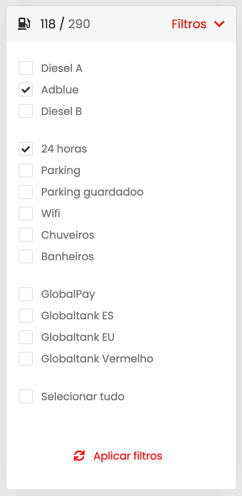 Você pode filtrar as estações mostradas no mapa por produtos, serviços e formas de pagamento. Se você não ativar nenhum filtro o aplicativo mostrará todas as estações disponíveis.