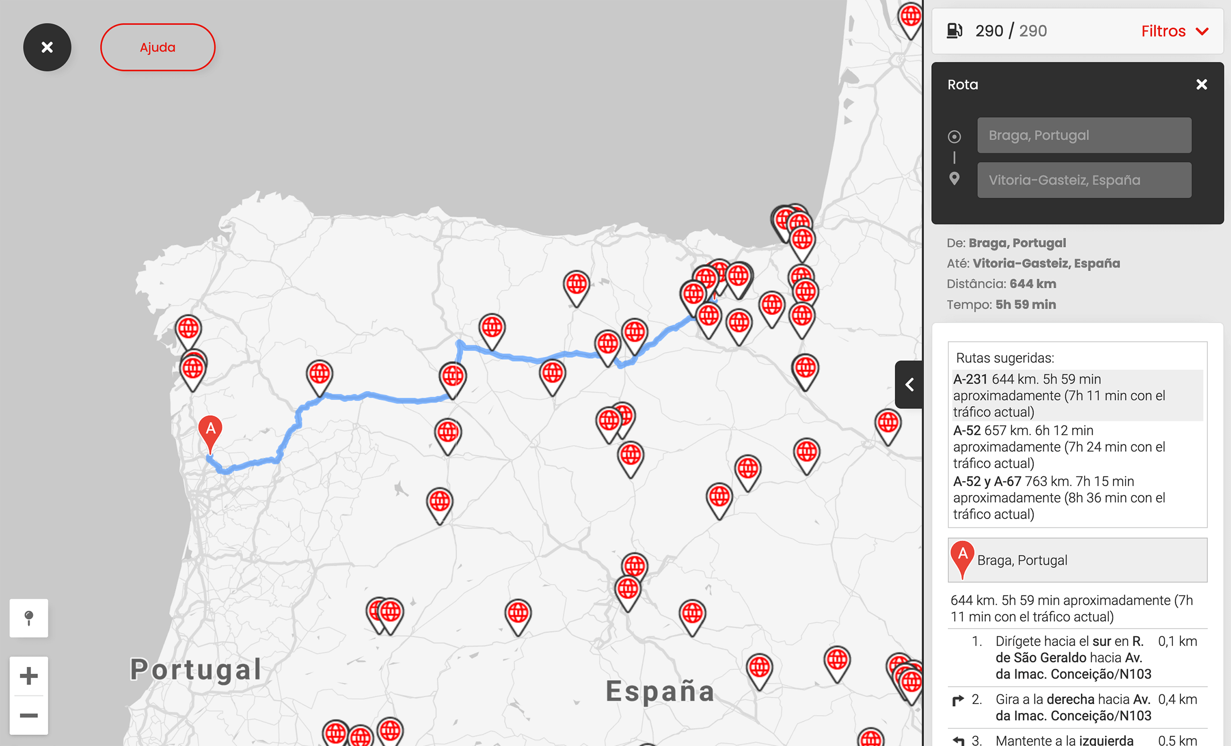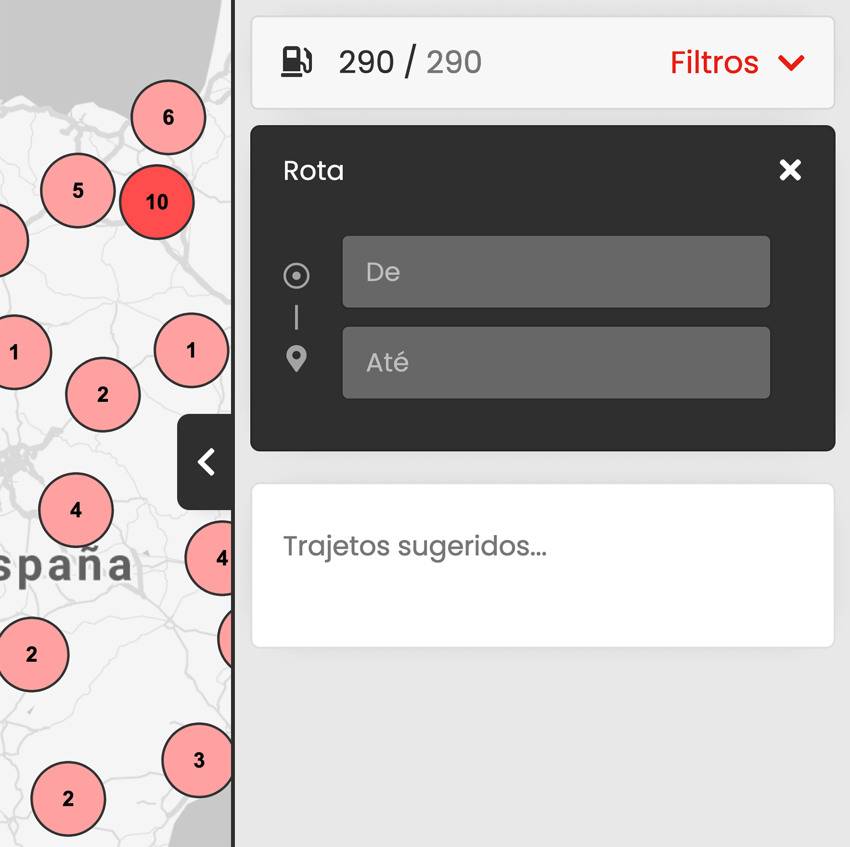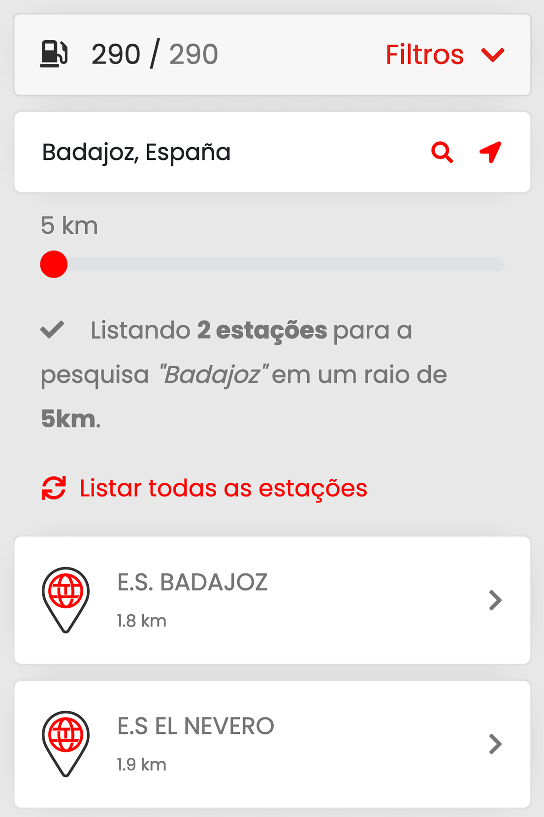 O motor de busca permite inserir uma localização personalizada (cidade, área geográfica, empresa, negócio, etc.) para encontrar as Estações de Serviço mais próximas no mapa.