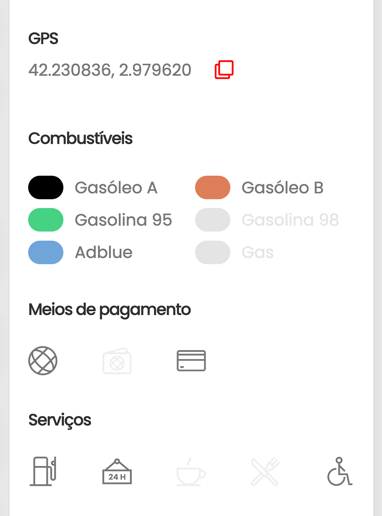 Ao clicar nos marcadores no mapa ou em qualquer caixa na lista de estações, você pode exibir uma janela de informações. Mostra os produtos, meios de pagamento e serviços disponíveis para cada Posto.